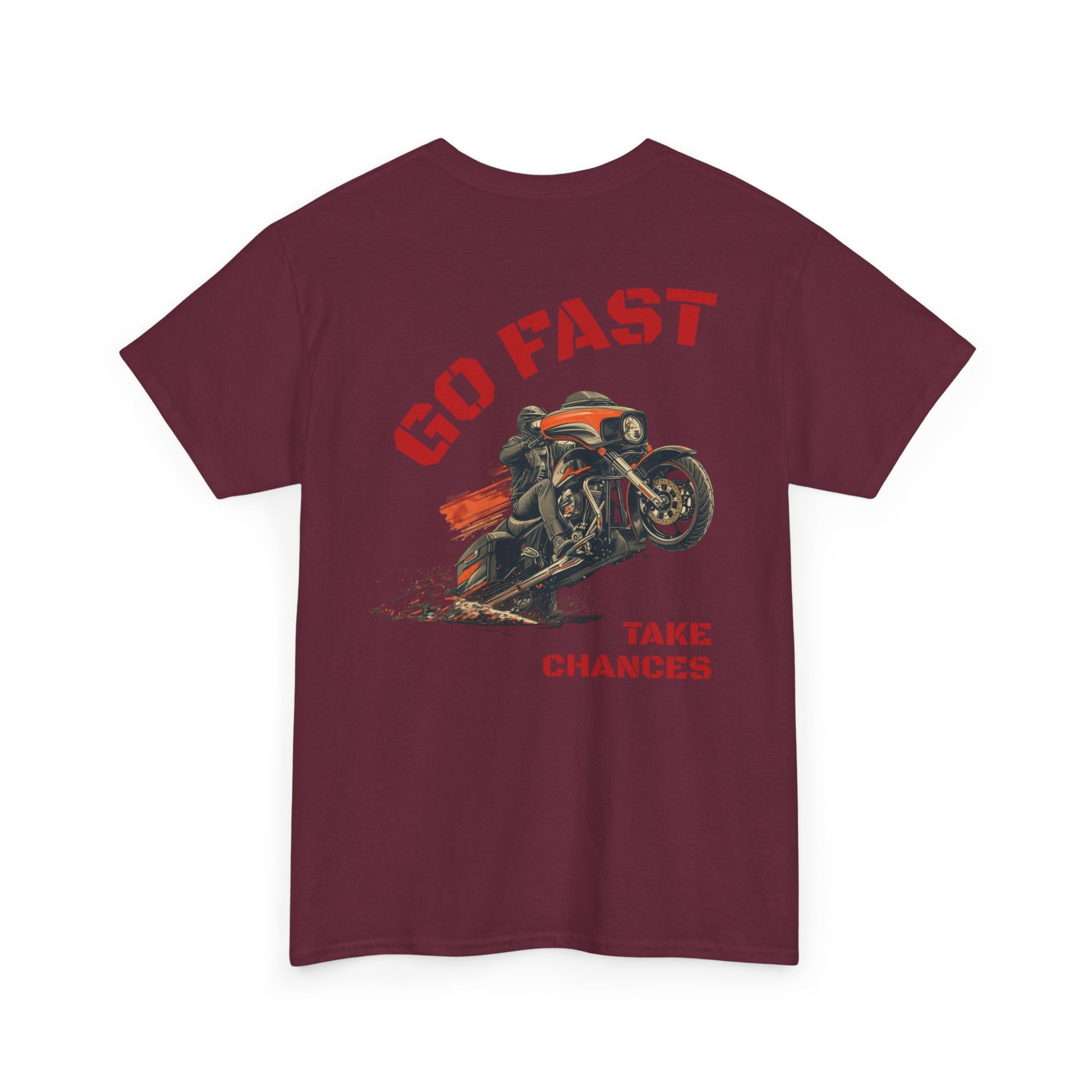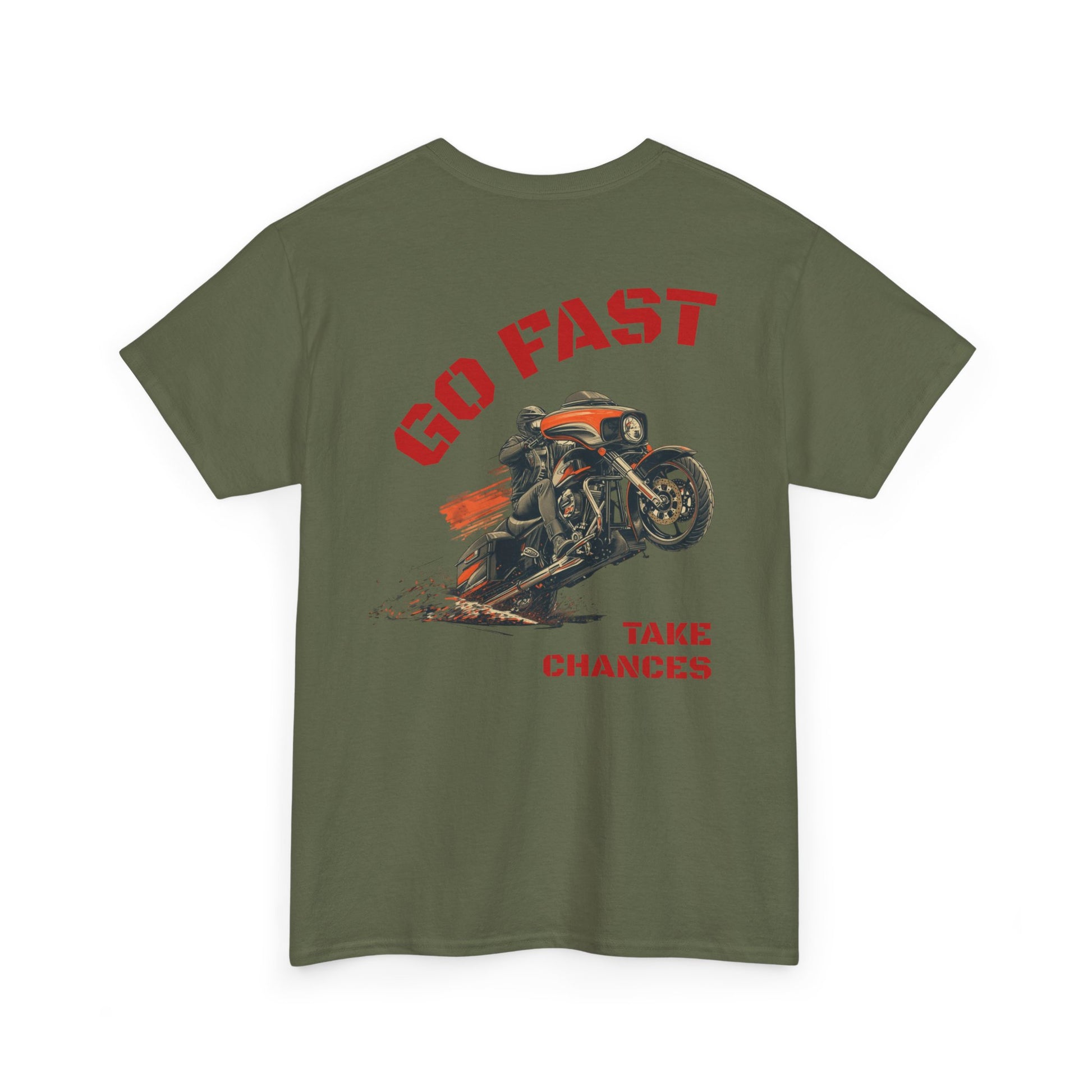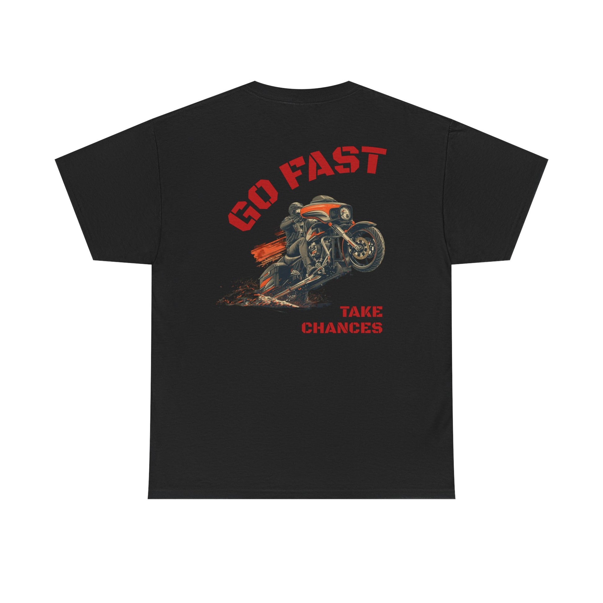 This relaxed cotton tee carries the grit and freedom of open roads. Across the back, a bold retro motorcycle graphic leans into motion with distressed red or black lettering that reads “GO FAST” and the smaller tagline “TAKE CHANCES.” The fabric feels sturdy yet breathable — a mid-weight knit that wears in over time and keeps prints crisp. Wear it with worn denim and boots for a day of short rides, garage hangs, or evening bonfires.
