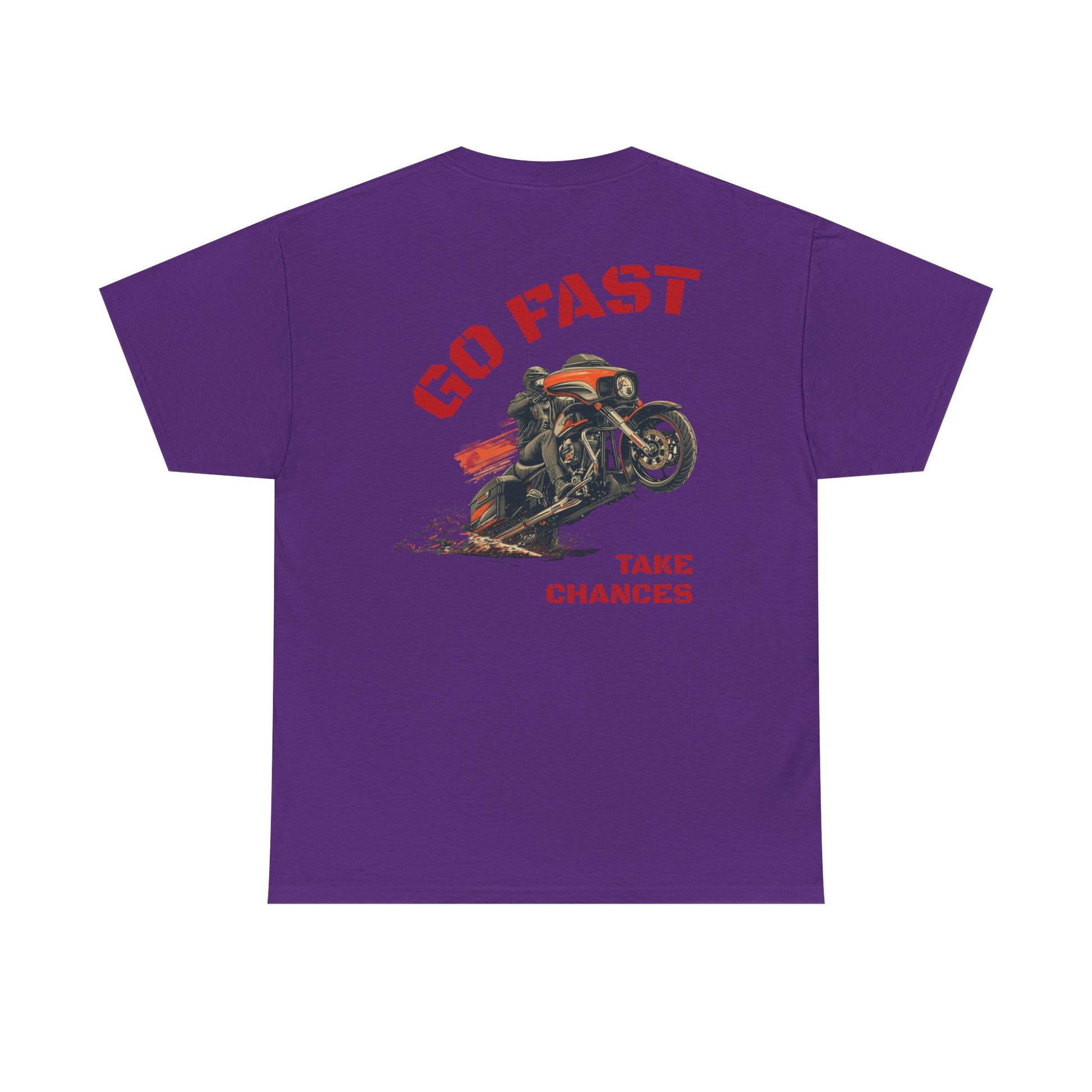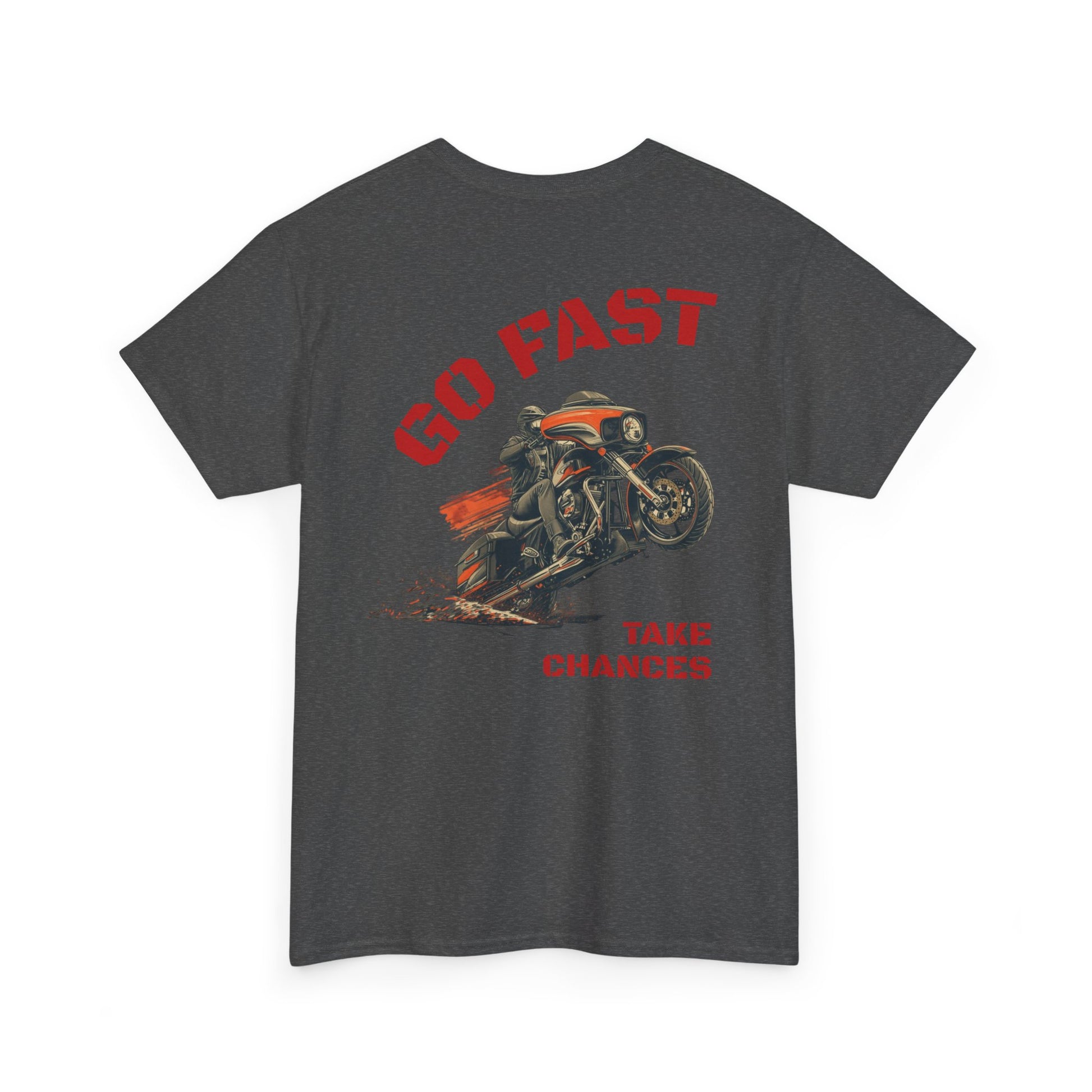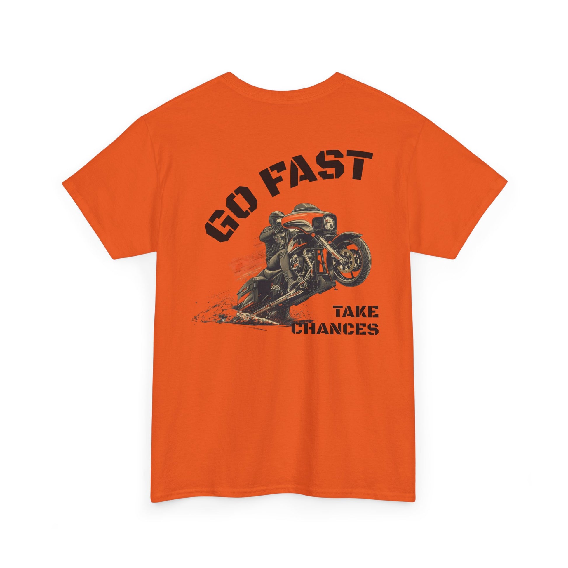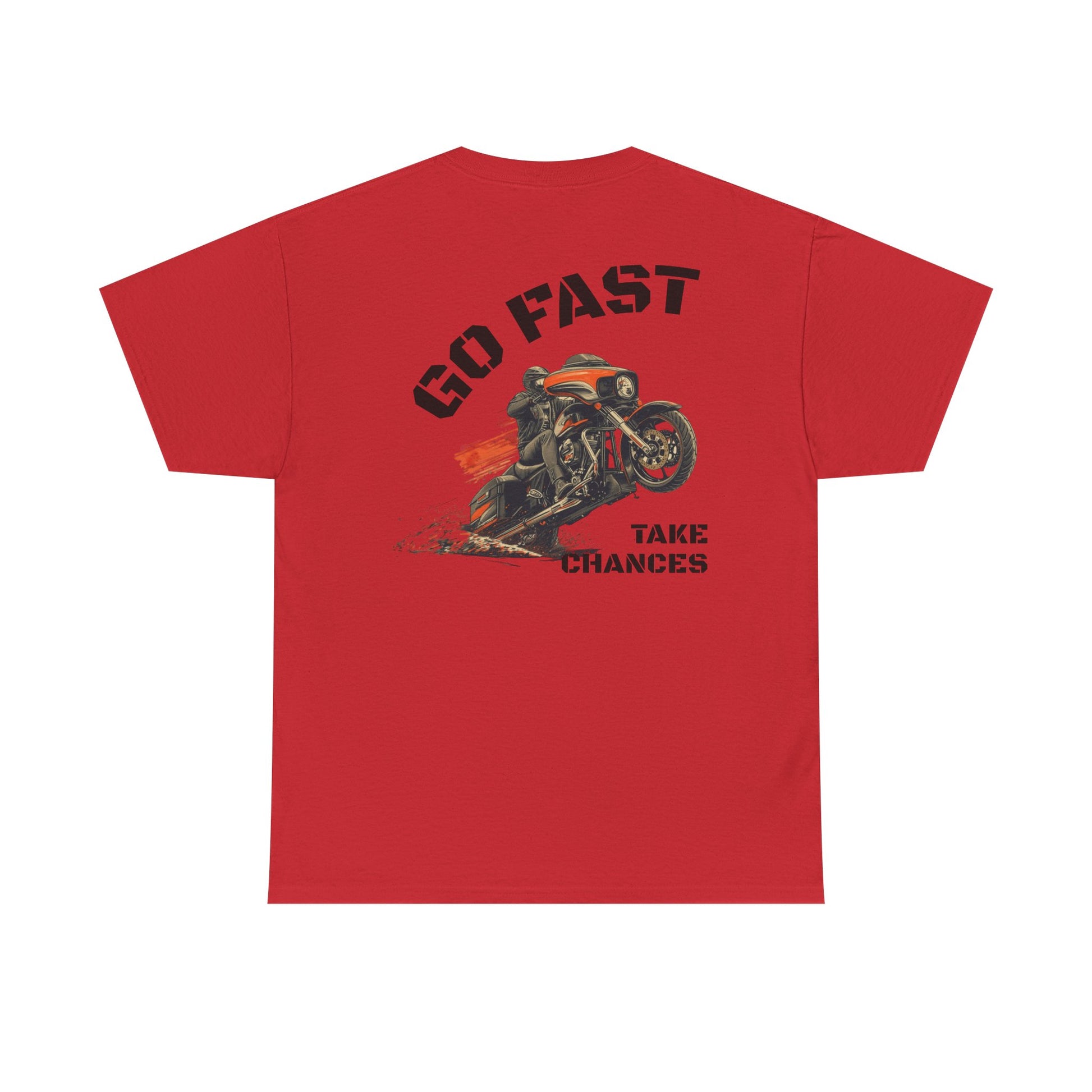 This relaxed cotton tee carries the grit and freedom of open roads. Across the back, a bold retro motorcycle graphic leans into motion with distressed red or black lettering that reads “GO FAST” and the smaller tagline “TAKE CHANCES.” The fabric feels sturdy yet breathable — a mid-weight knit that wears in over time and keeps prints crisp. Wear it with worn denim and boots for a day of short rides, garage hangs, or evening bonfires.